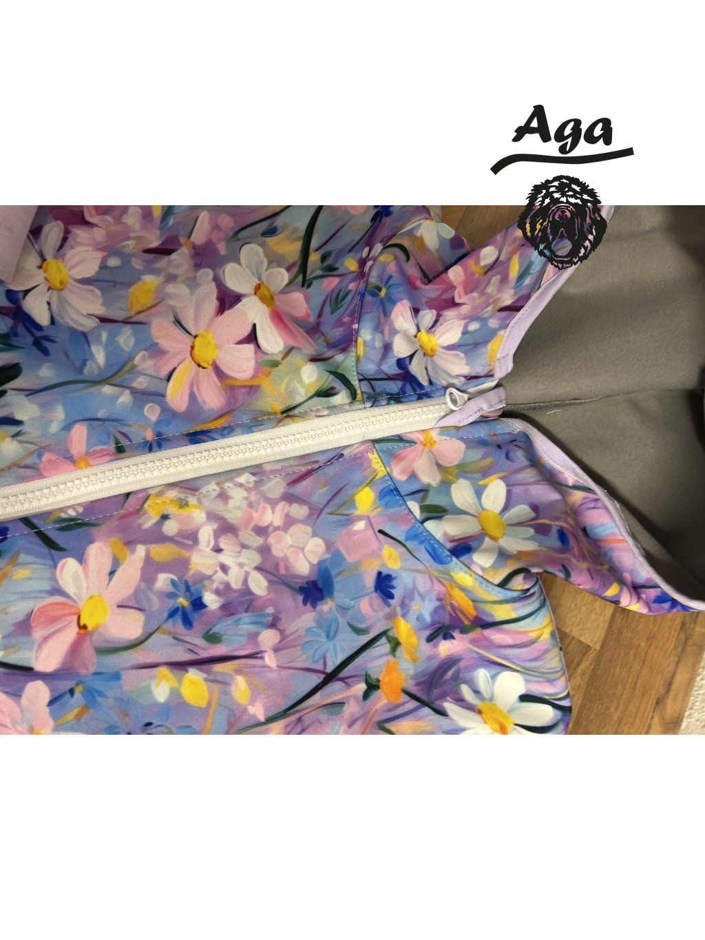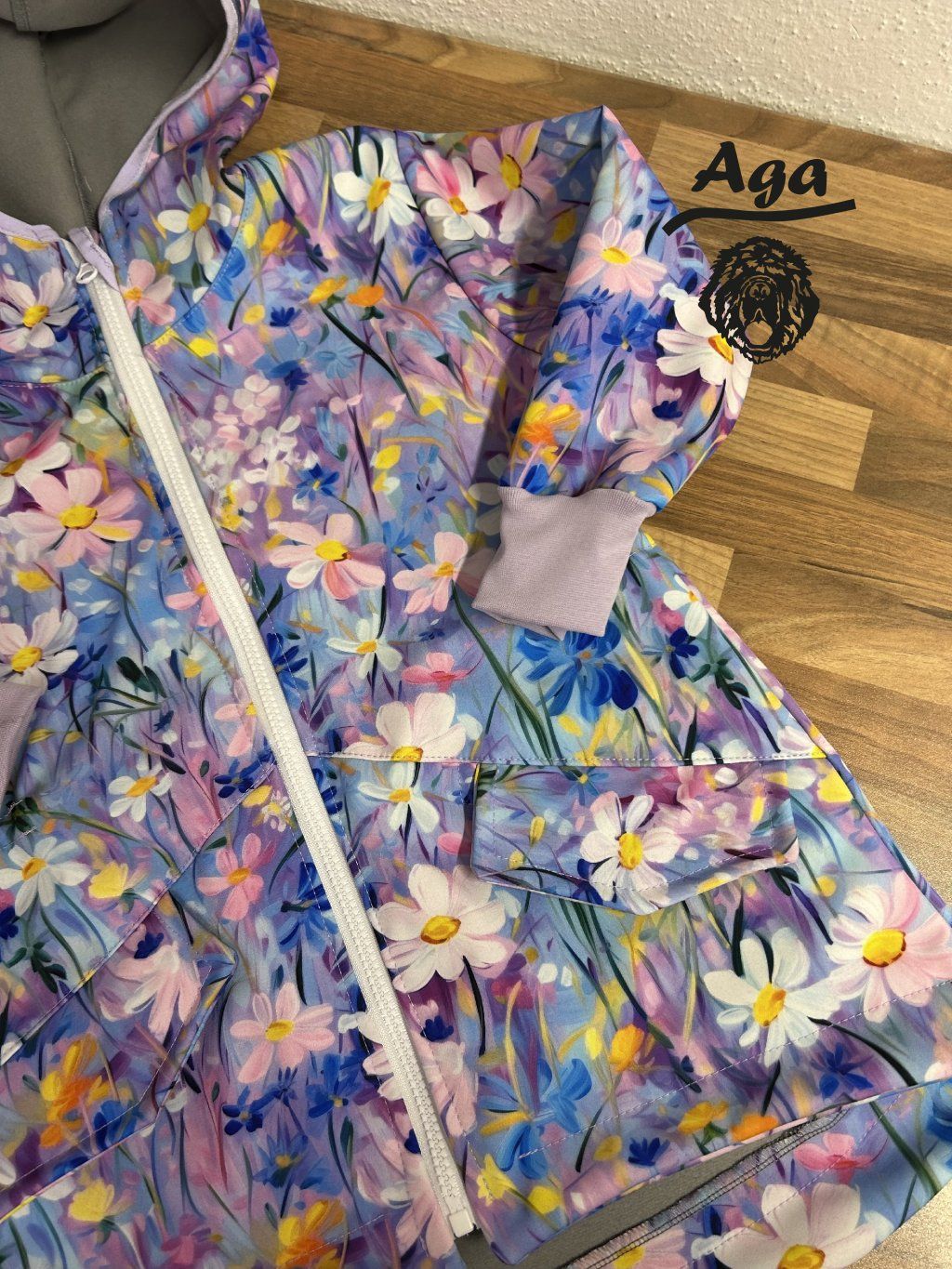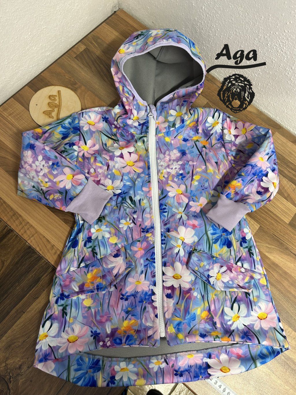 Tento kabátek je volnějšího střihu se stahováním v pase. Od pasu dolu po stažení tvoří efekt sukně. Navržen aby se pod kabátek vešla i silnější mikina. Velikost berte dle skutečné výšky dívek.